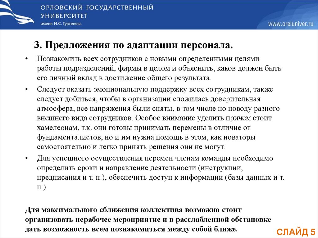 3. Предложения по адаптации персонала.Познакомить всех сотрудников с новыми определенными целями