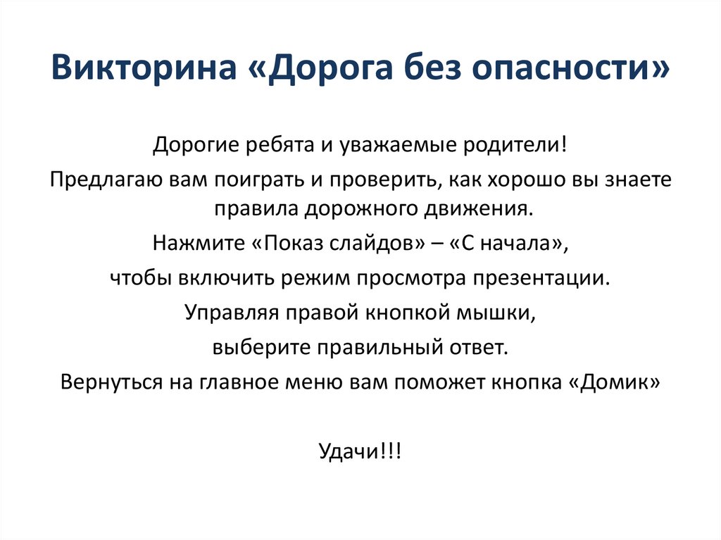 Викторина «Дорога без опасности»Дорогие ребята и уважаемые родители!