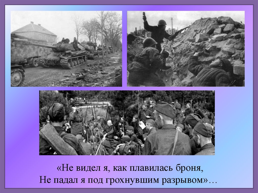 «Не видел я, как плавилась броня,Не падал я под грохнувшим разрывом»…