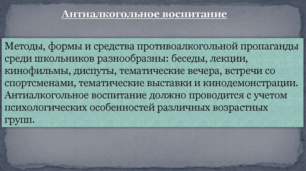 Антиалкогольное воспитаниеМетоды, формы и средства противоалкогольной пропаганды