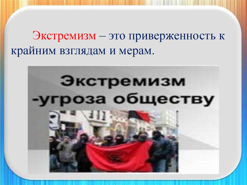 Экстремизм – это приверженность ккрайним взглядам и мерам.