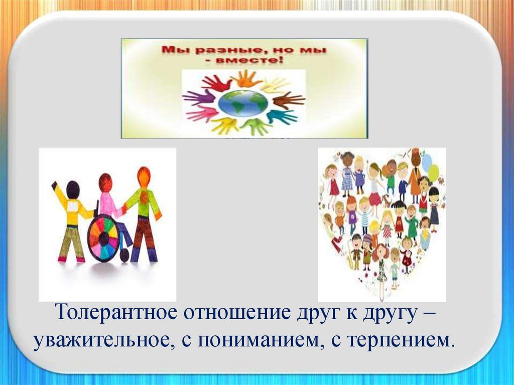 Толерантное отношение друг к другу –уважительное, с пониманием, с терпением.