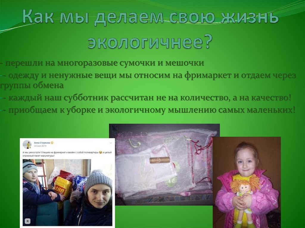 - перешли на многоразовые сумочки и мешочки-- одежду и ненужные вещи мы относим на фримаркет и отдаем через
