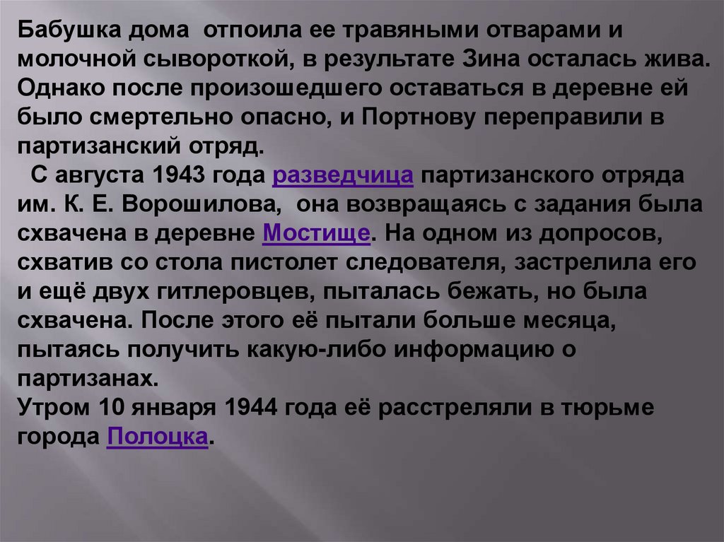 Бабушка дома отпоила ее травяными отварами имолочной сывороткой, в результате Зина осталась жива.