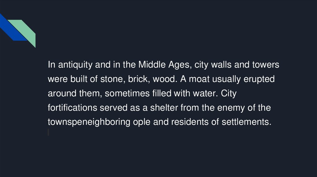 In antiquity and in the Middle Ages, city walls and towerswere built of stone, brick, wood. A moat usually erupted