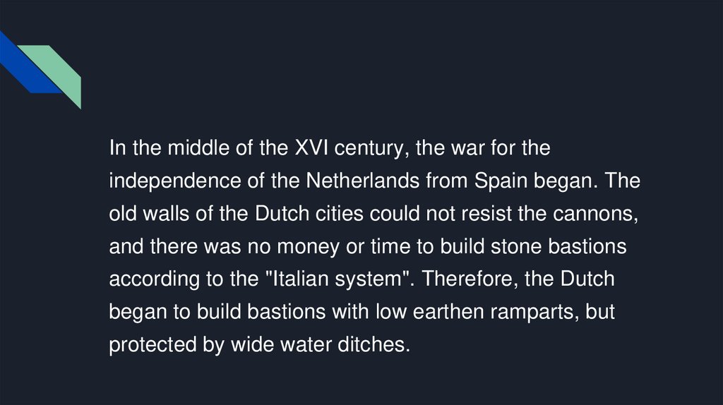In the middle of the XVI century, the war for theindependence of the Netherlands from Spain began. The