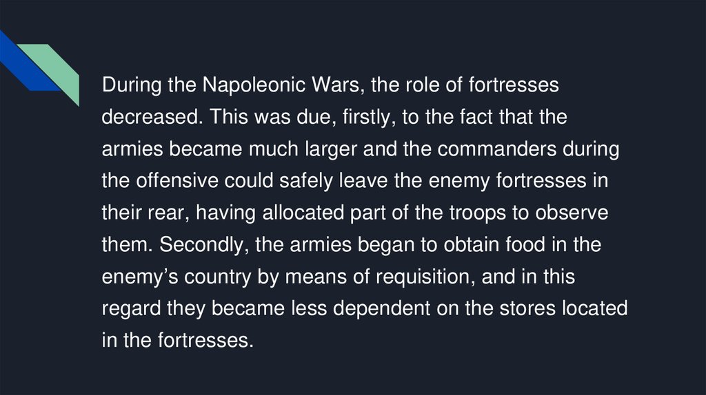 During the Napoleonic Wars, the role of fortressesdecreased. This was due, firstly, to the fact that the