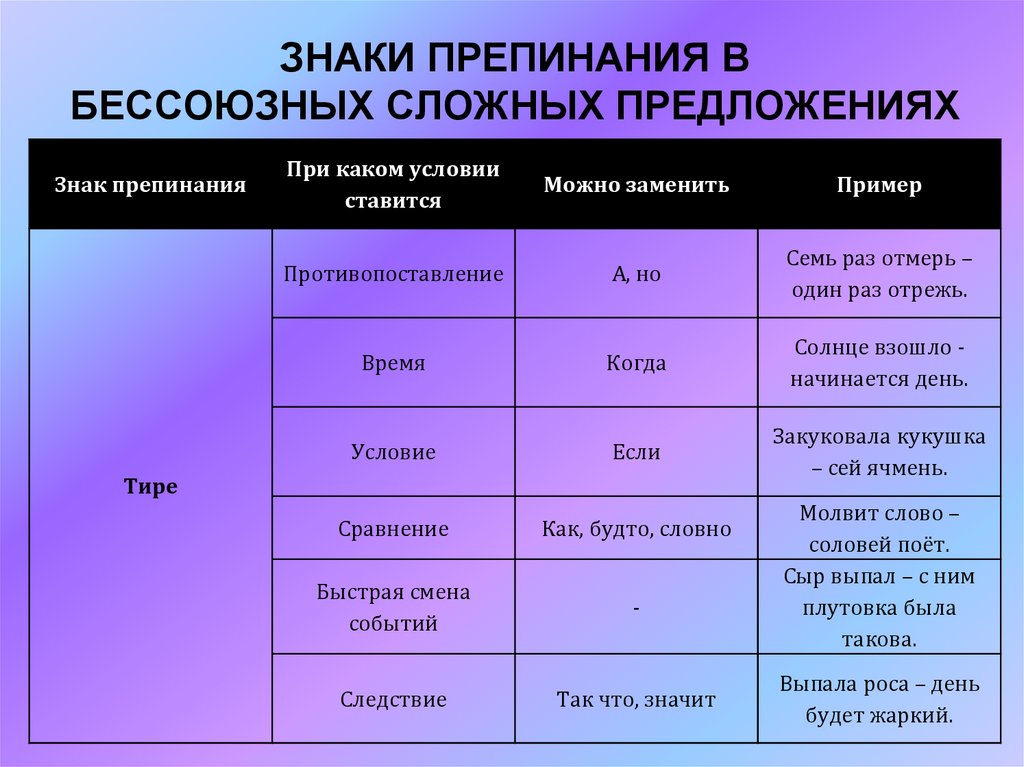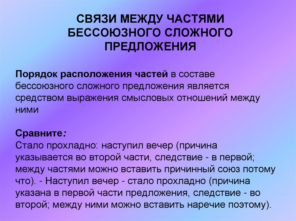 пояснительно-изъяснительные, сопоставительнопротивительные, условно-временные, следствия).