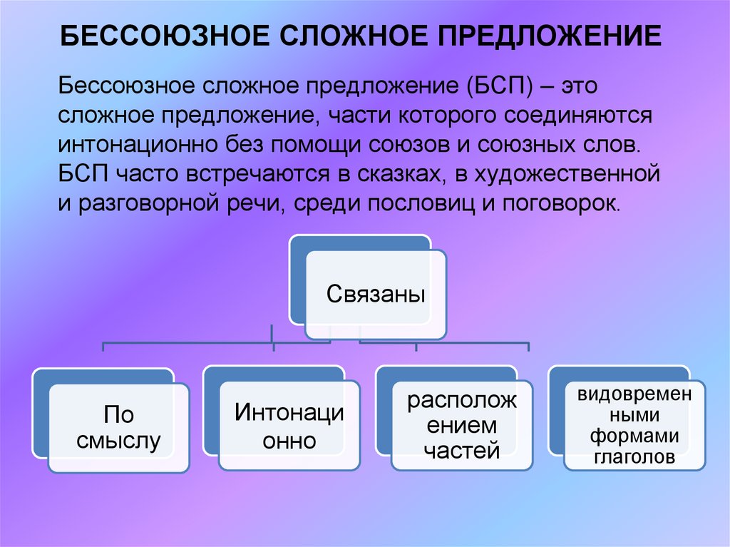 БЕССОЮЗНОЕ СЛОЖНОЕ ПРЕДЛОЖЕНИЕБессоюзное сложное предложение (БСП) – это