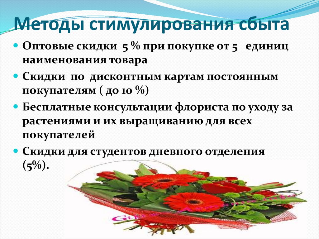 Методы стимулирования сбытаОптовые скидки 5 % при покупке от 5 единиц