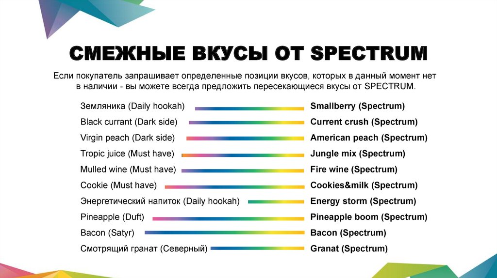 СМЕЖНЫЕ ВКУСЫ ОТ SPECTRUMЕсли покупатель запрашивает определенные позиции вкусов, которых в данный момент нет