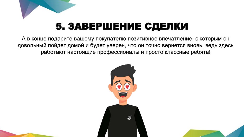 5. ЗАВЕРШЕНИЕ СДЕЛКИА в конце подарите вашему покупателю позитивное впечатление, с которым он