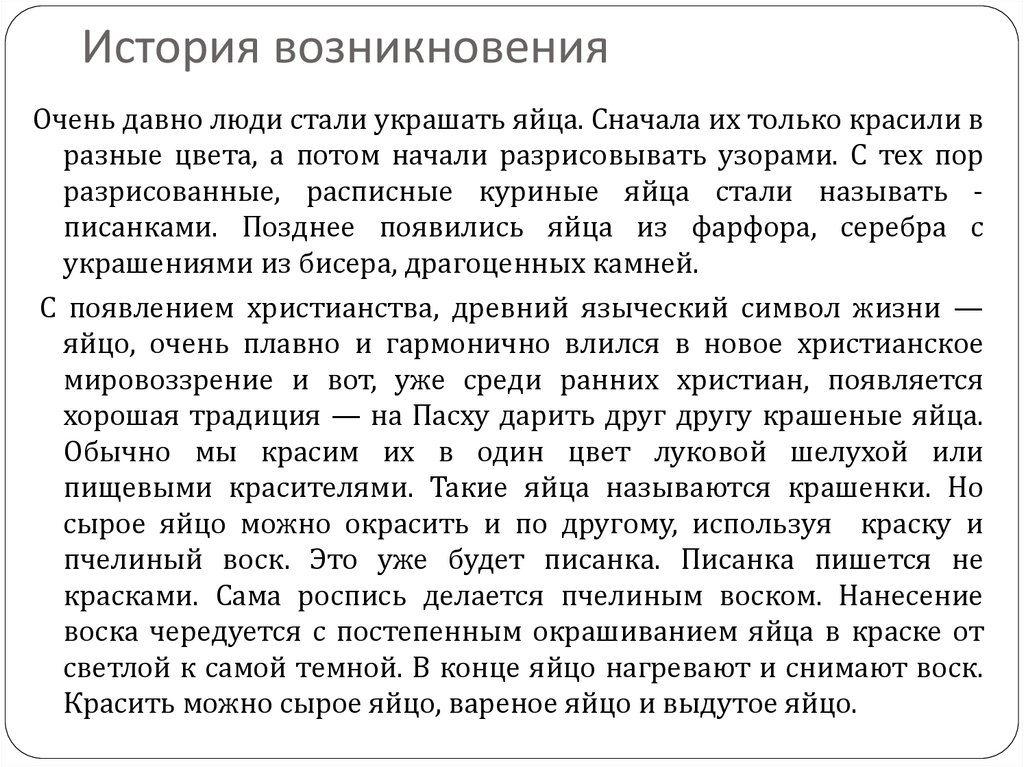 История возникновенияОчень давно люди стали украшать яйца. Сначала их только красили в