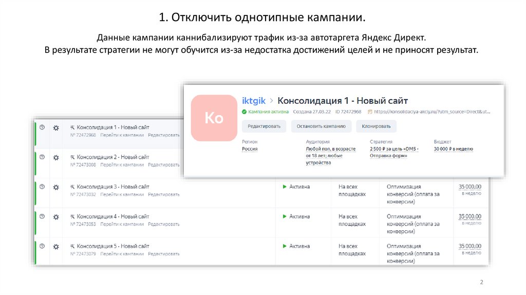 1. Отключить однотипные кампании.Данные кампании каннибализируют трафик из-за автотаргета Яндекс Директ.