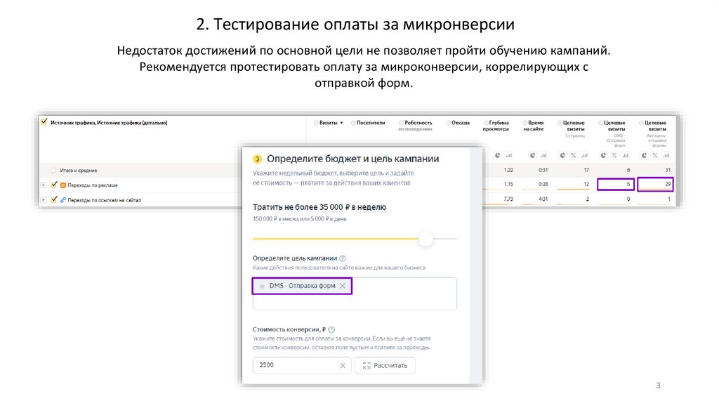 2. Тестирование оплаты за микронверсииНедостаток достижений по основной цели не позволяет пройти обучению кампаний.