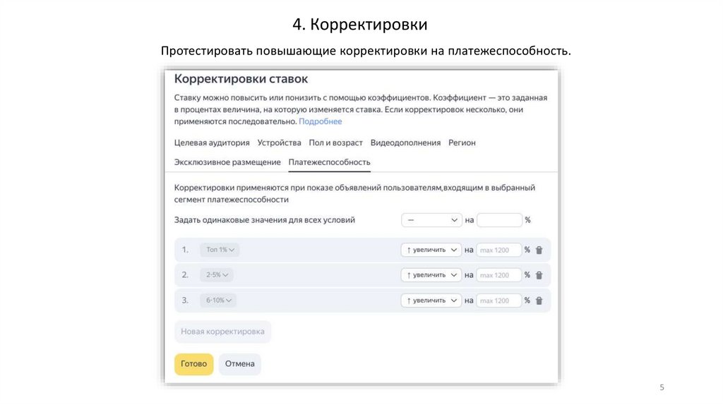 4. КорректировкиПротестировать повышающие корректировки на платежеспособность.