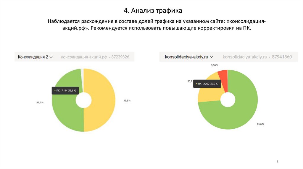 4. Анализ трафикаНаблюдается расхождение в составе долей трафика на указанном сайте: «консолидацияакций.рф». Рекомендуется использовать повышающие корректировки на ПК.