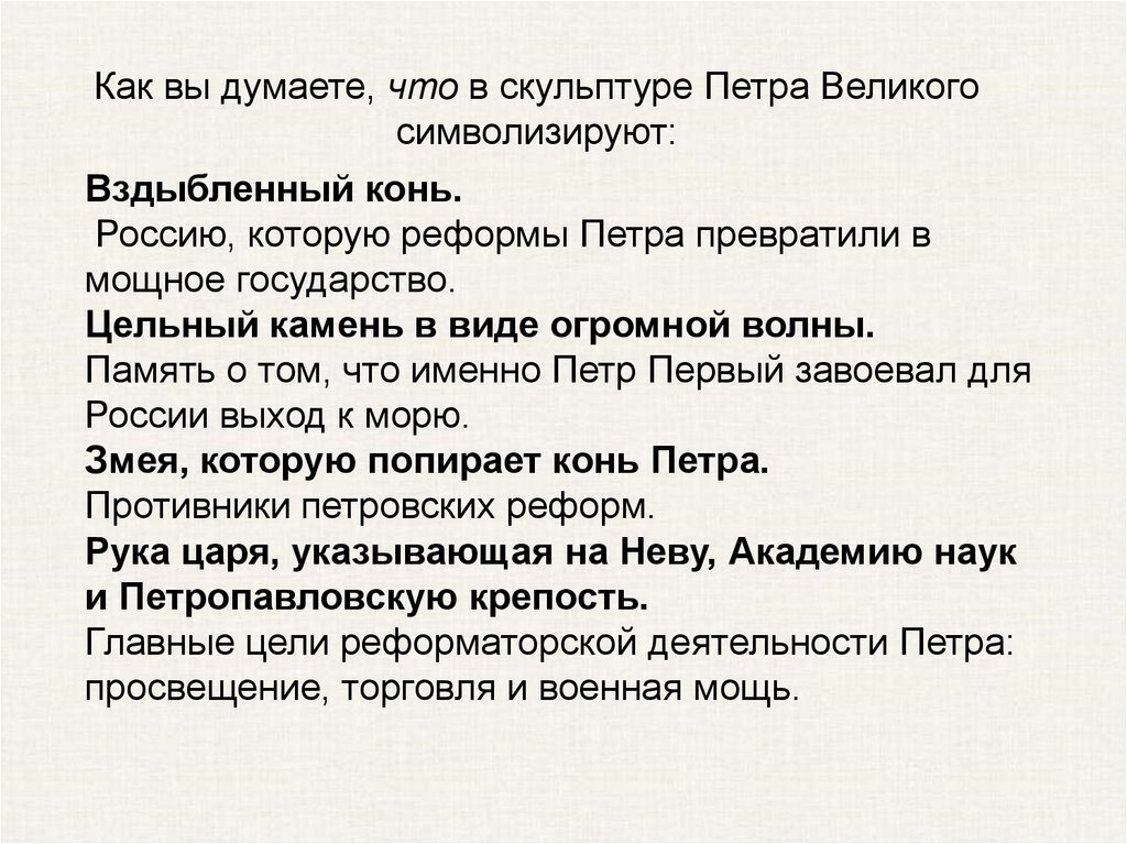 Как вы думаете, что в скульптуре Петра Великогосимволизируют: