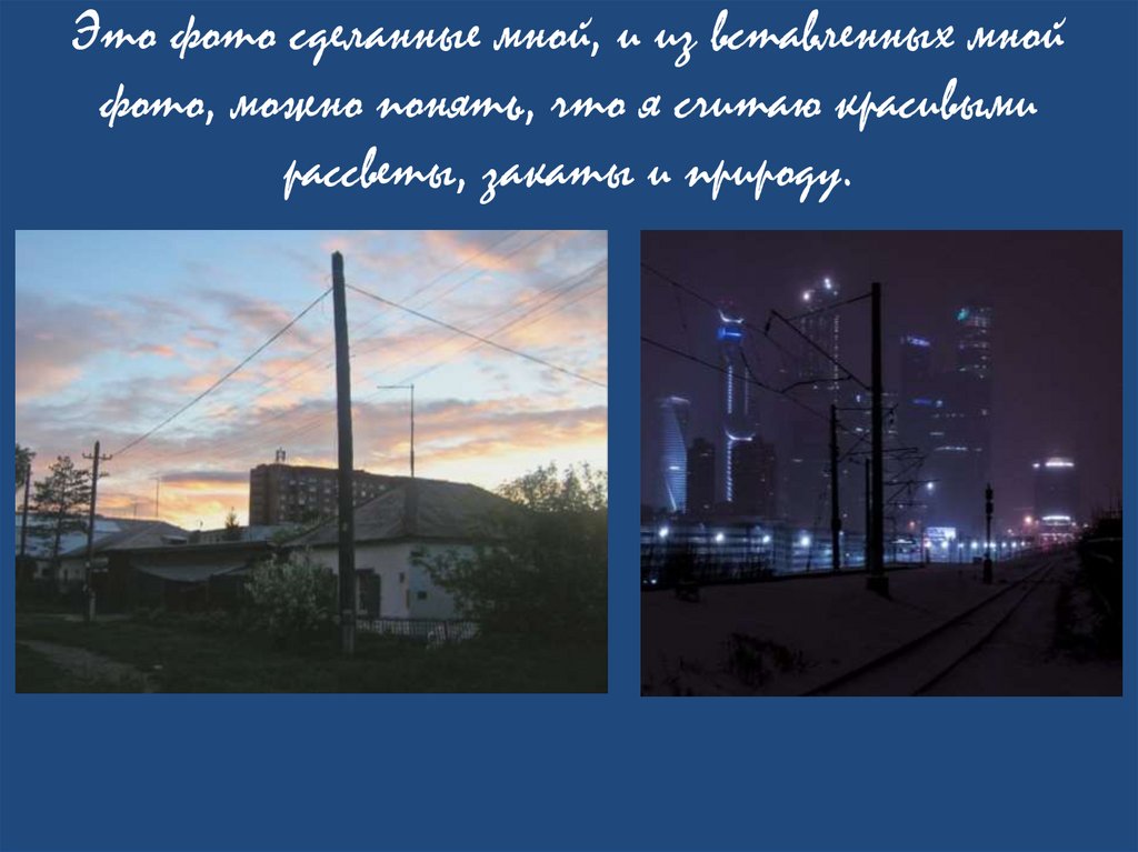 Это фото сделанные мной, и из вставленных мнойфото, можно понять, что я считаю красивыми