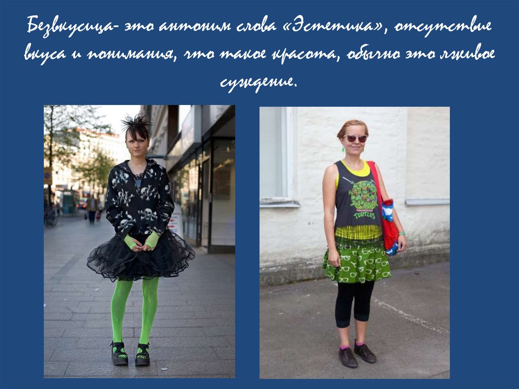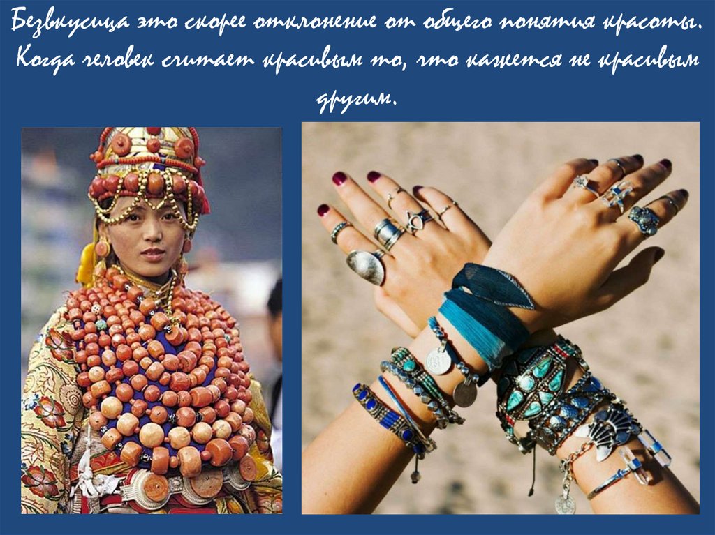 Безвкусица это скорее отклонение от общего понятия красоты.Когда человек считает красивым то, что кажется не красивым