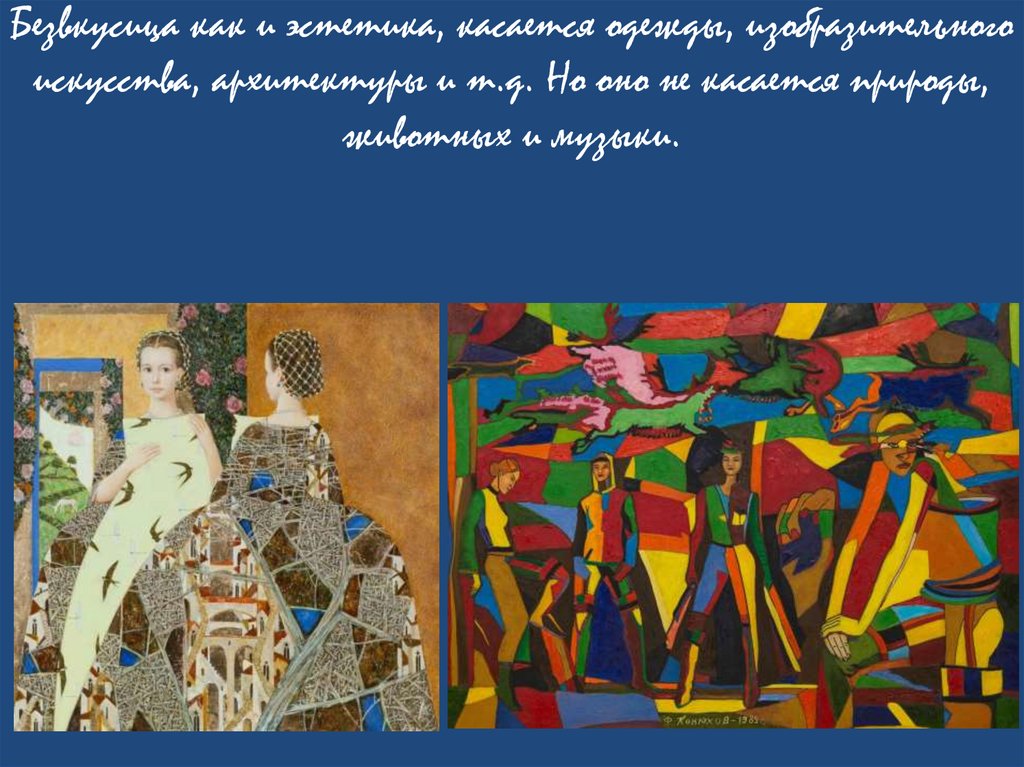 Безвкусица как и эстетика, касается одежды, изобразительногоискусства, архитектуры и т.д. Но оно не касается природы,