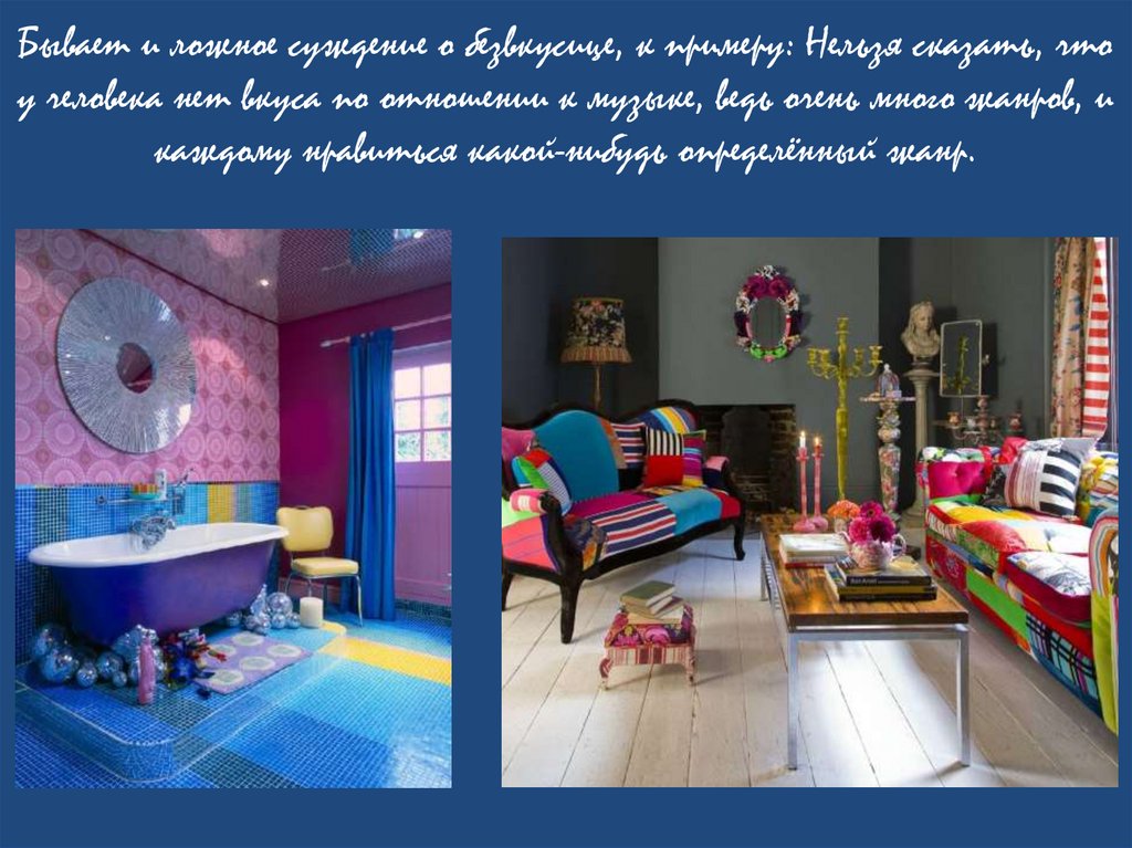 Бывает и ложное суждение о безвкусице, к примеру: Нельзя сказать, чтоу человека нет вкуса по отношении к музыке, ведь очень много жанров, и