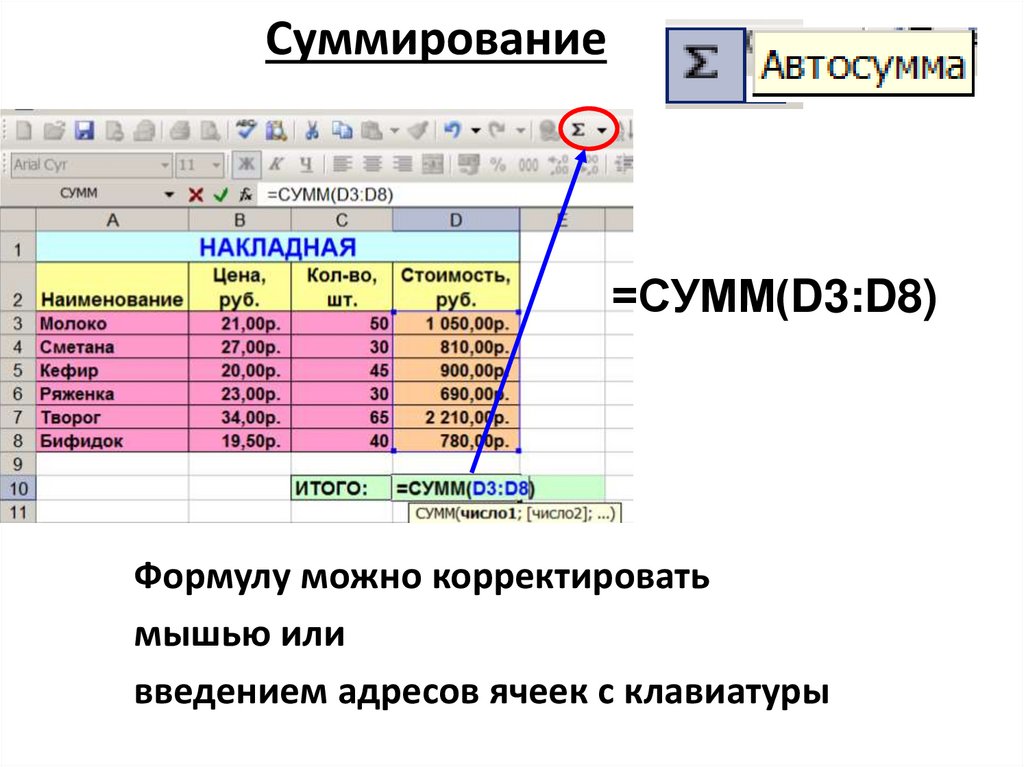 Суммирование=СУММ(D3:D8)
