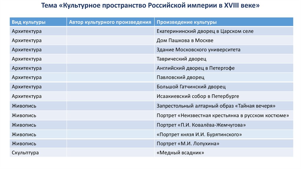 Тема «Культурное пространство Российской империи в XVIII веке»Вид культуры