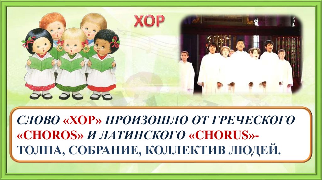 СЛОВО «ХОР» ПРОИЗОШЛО ОТ ГРЕЧЕСКОГО«CHOROS» И ЛАТИНСКОГО «CHORUS»ТОЛПА, СОБРАНИЕ, КОЛЛЕКТИВ ЛЮДЕЙ.