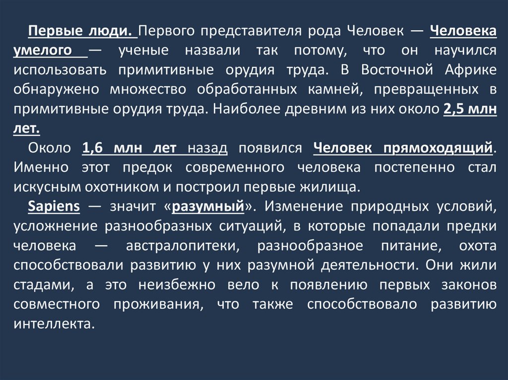 Первые люди. Первого представителя рода Человек — Человекаумелого — ученые назвали так потому, что он научился