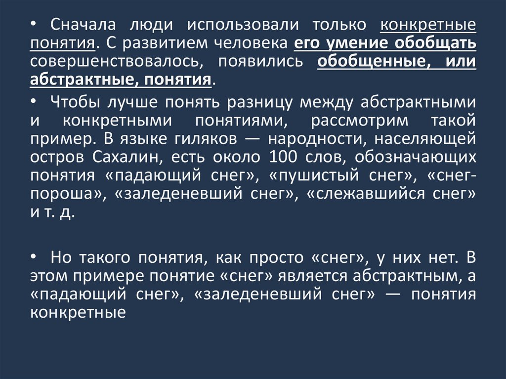 • Сначала люди использовали только конкретныепонятия. С развитием человека его умение обобщать