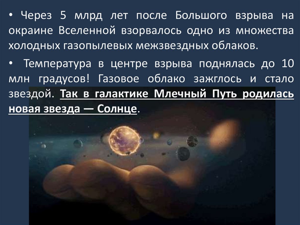• Через 5 млрд лет после Большого взрыва наокраине Вселенной взорвалось одно из множества