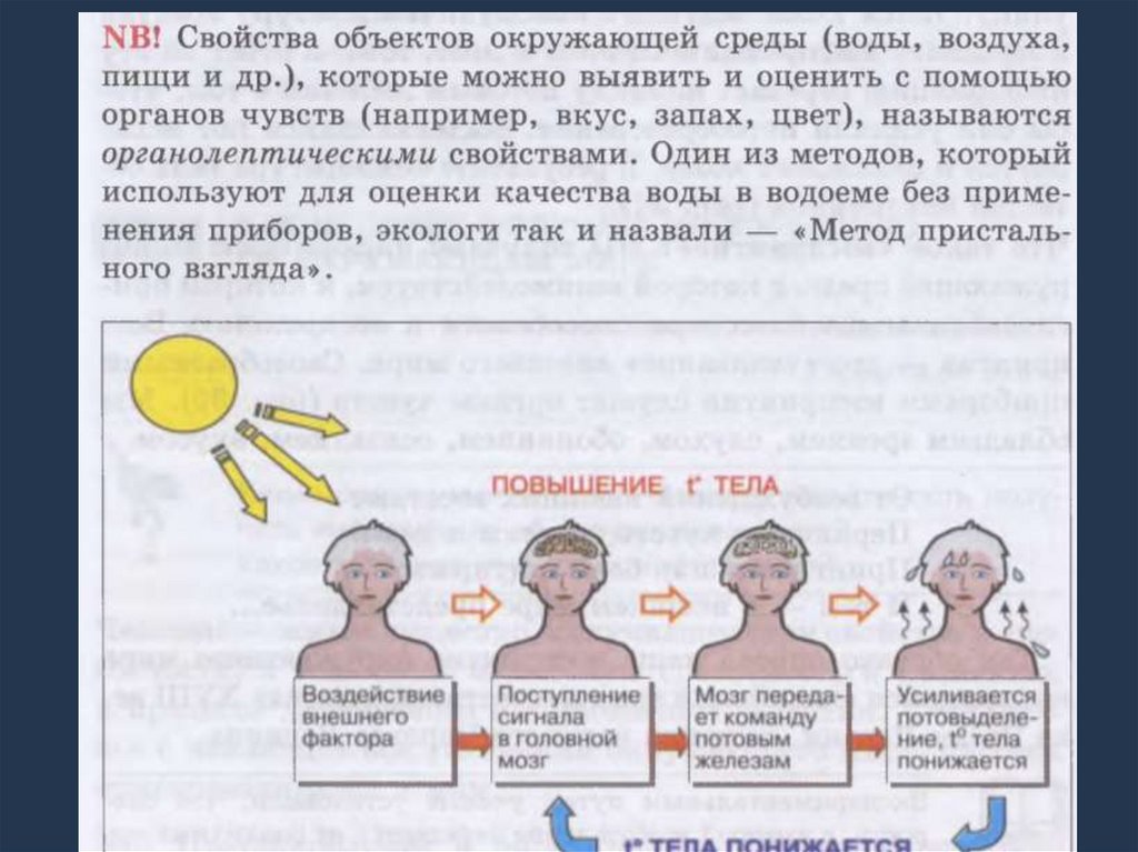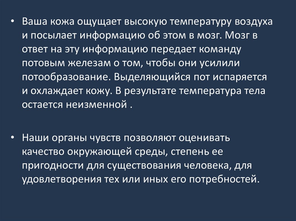 • Ваша кожа ощущает высокую температуру воздухаи посылает информацию об этом в мозг. Мозг в