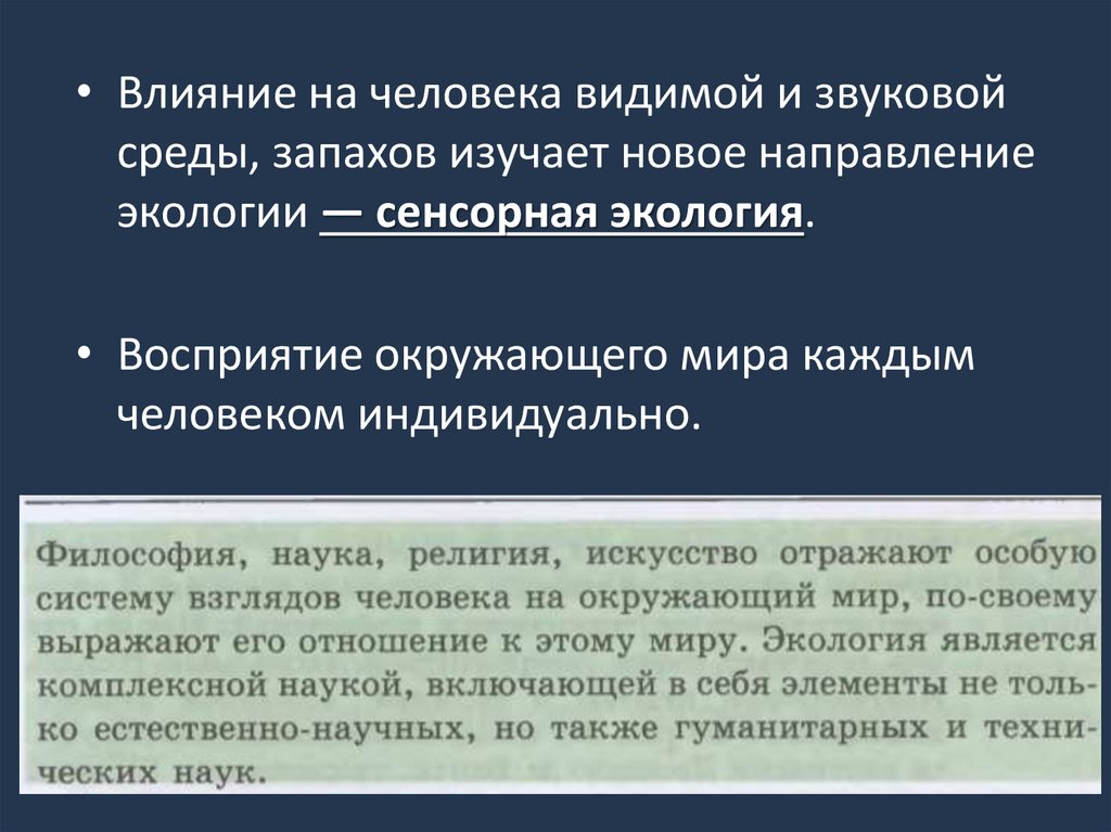 • Влияние на человека видимой и звуковойсреды, запахов изучает новое направление