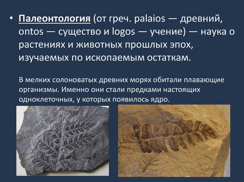 • Палеонтология (от греч. palaios — древний,ontos — существо и logos — учение) — наука о