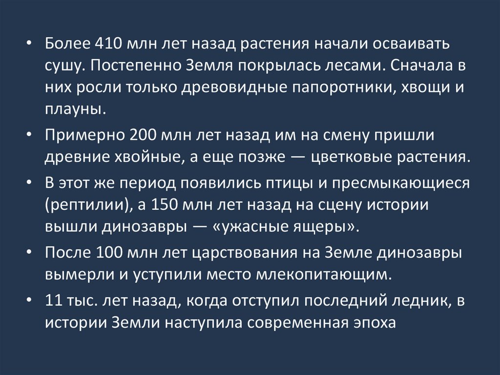 • Более 410 млн лет назад растения начали осваиватьсушу. Постепенно Земля покрылась лесами. Сначала в