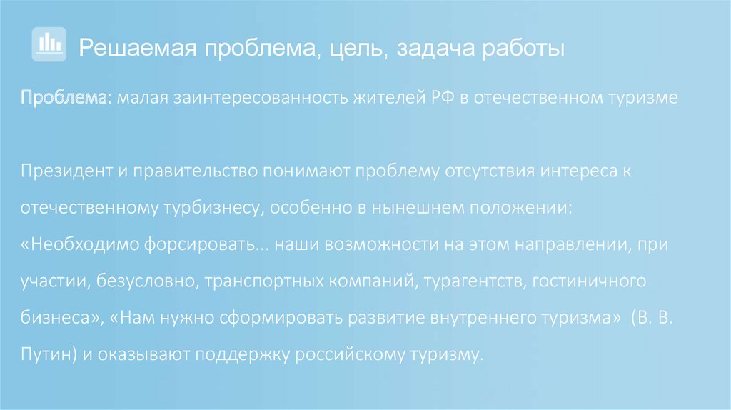 Решаемая проблема, цель, задача работыПроблема: малая заинтересованность жителей РФ в отечественном туризме
