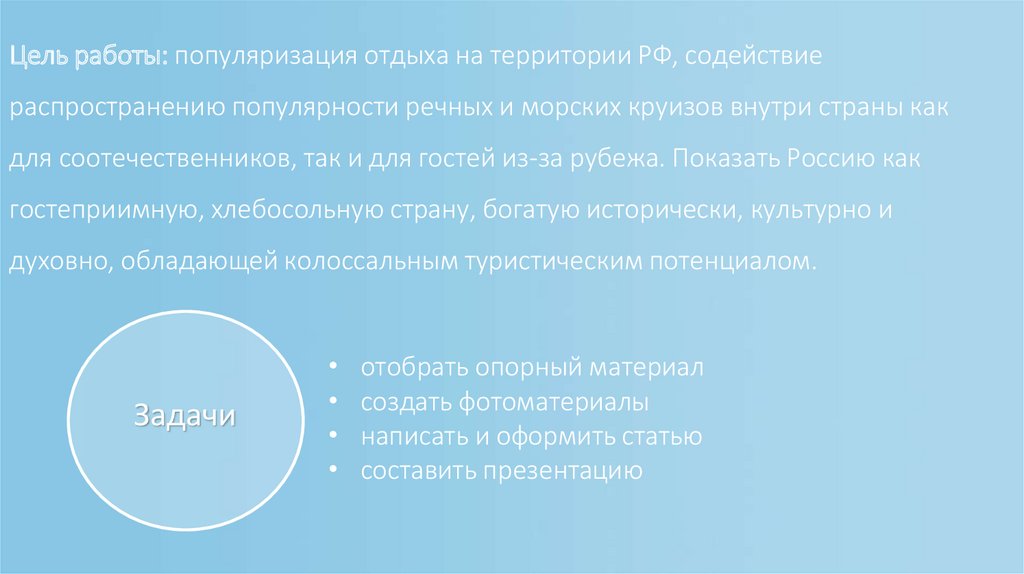 Цель работы: популяризация отдыха на территории РФ, содействиераспространению популярности речных и морских круизов внутри страны как