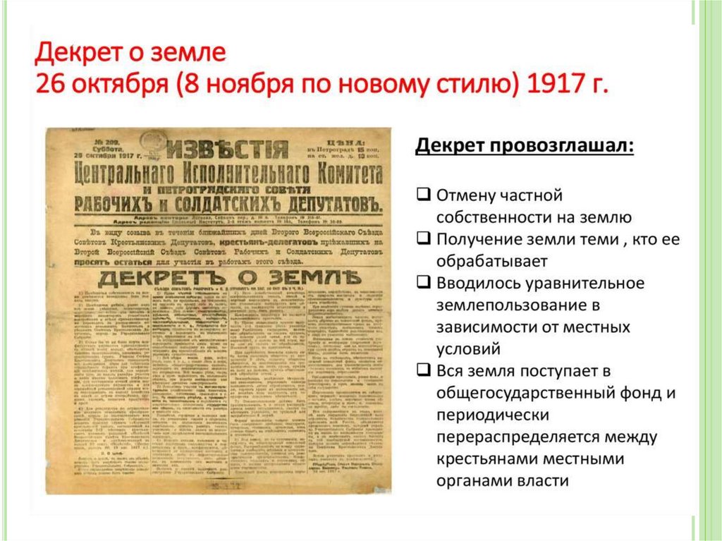 Советов от 26 октября (7 ноября) 1917 г. «О земле».