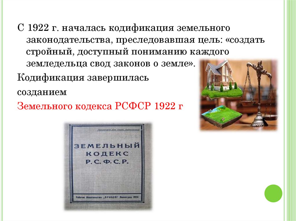 С 1922 г. началась кодификация земельногозаконодательства, преследовавшая цель: «создать