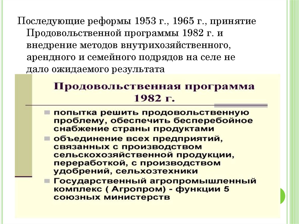 Последующие реформы 1953 г., 1965 г., принятиеПродовольственной программы 1982 г. и