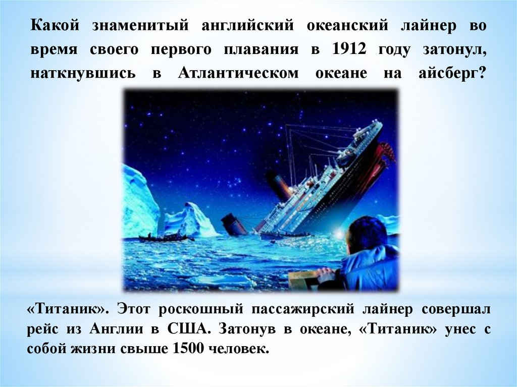 Какой знаменитый английский океанский лайнер вовремя своего первого плавания в 1912 году затонул,