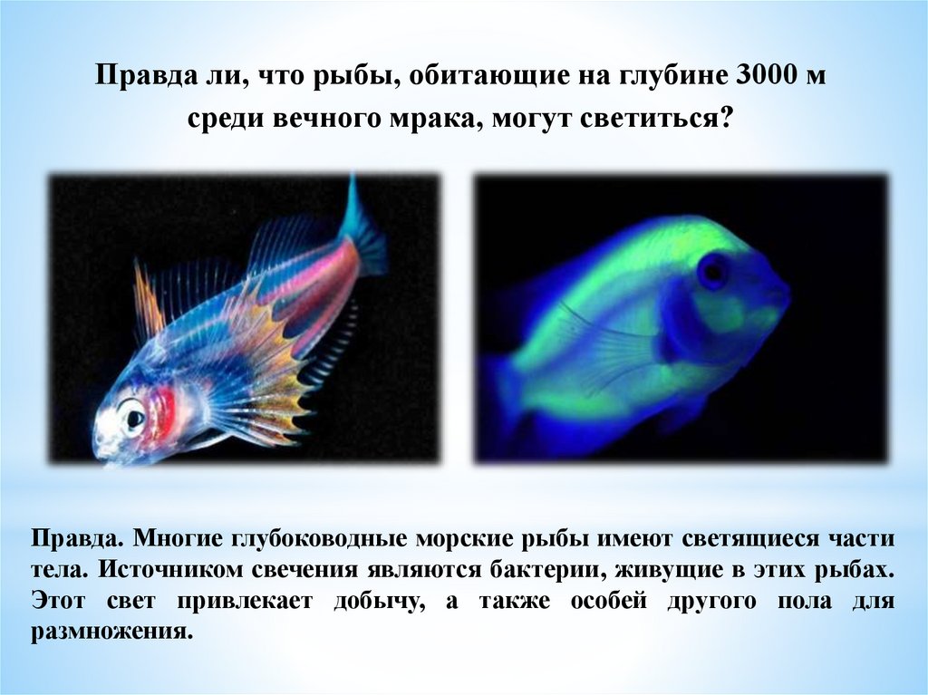 Правда ли, что рыбы, обитающие на глубине 3000 мсреди вечного мрака, могут светиться?