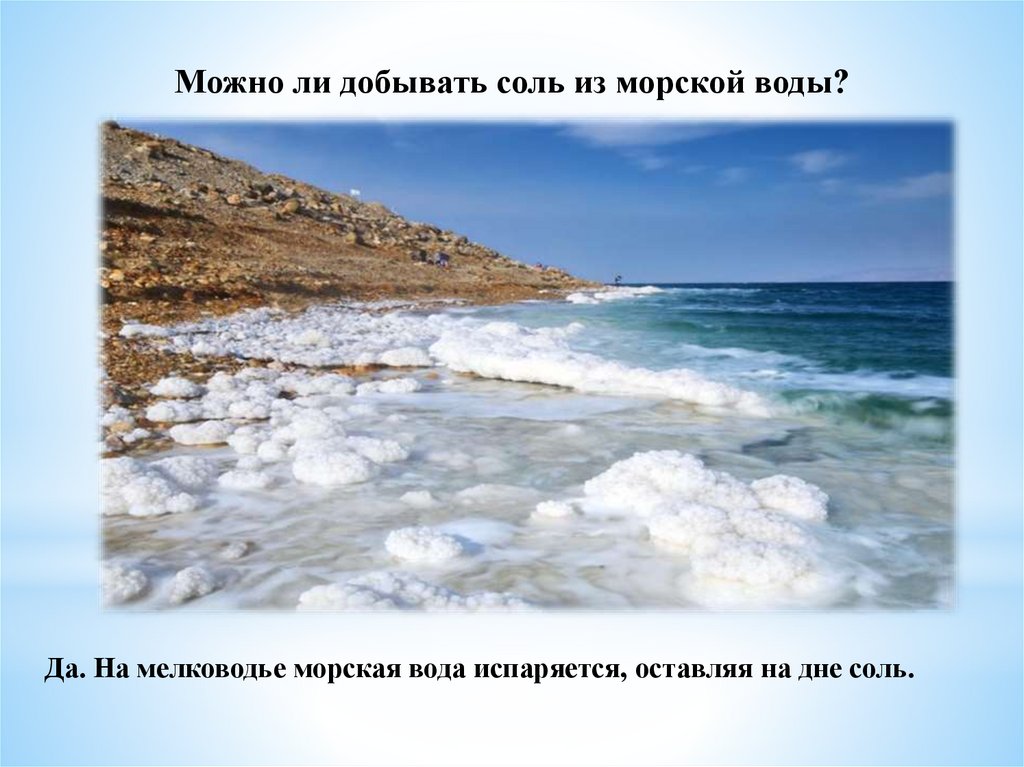 Можно ли добывать соль из морской воды?Да. На мелководье морская вода испаряется, оставляя на дне соль.