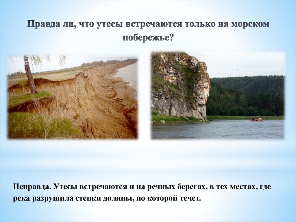 Неправда. Утесы встречаются и на речных берегах, в тех местах, гдерека разрушила стенки долины, по которой течет.