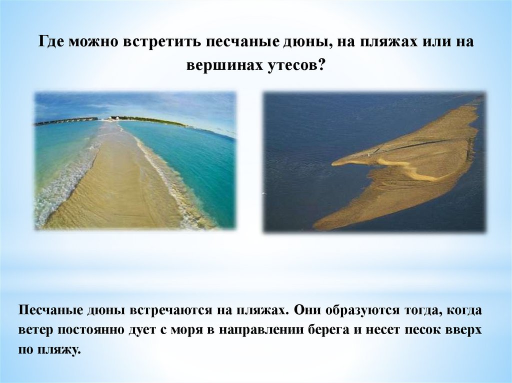 Песчаные дюны встречаются на пляжах. Они образуются тогда, когда