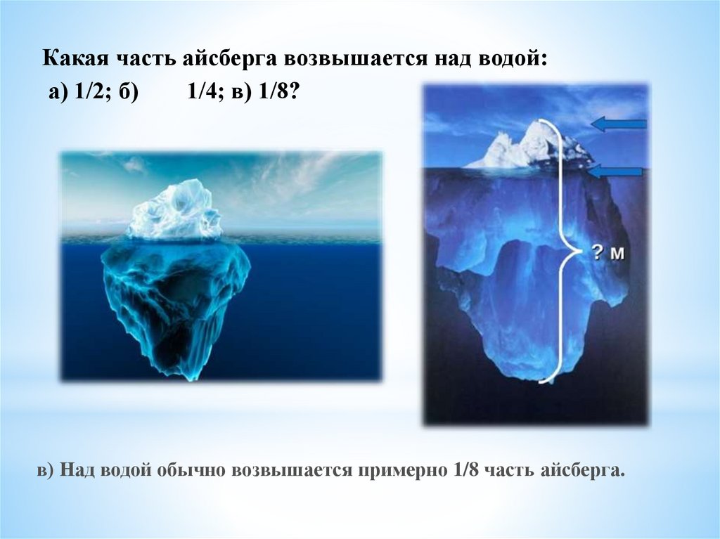 Какая часть айсберга возвышается над водой:а) 1/2; б)