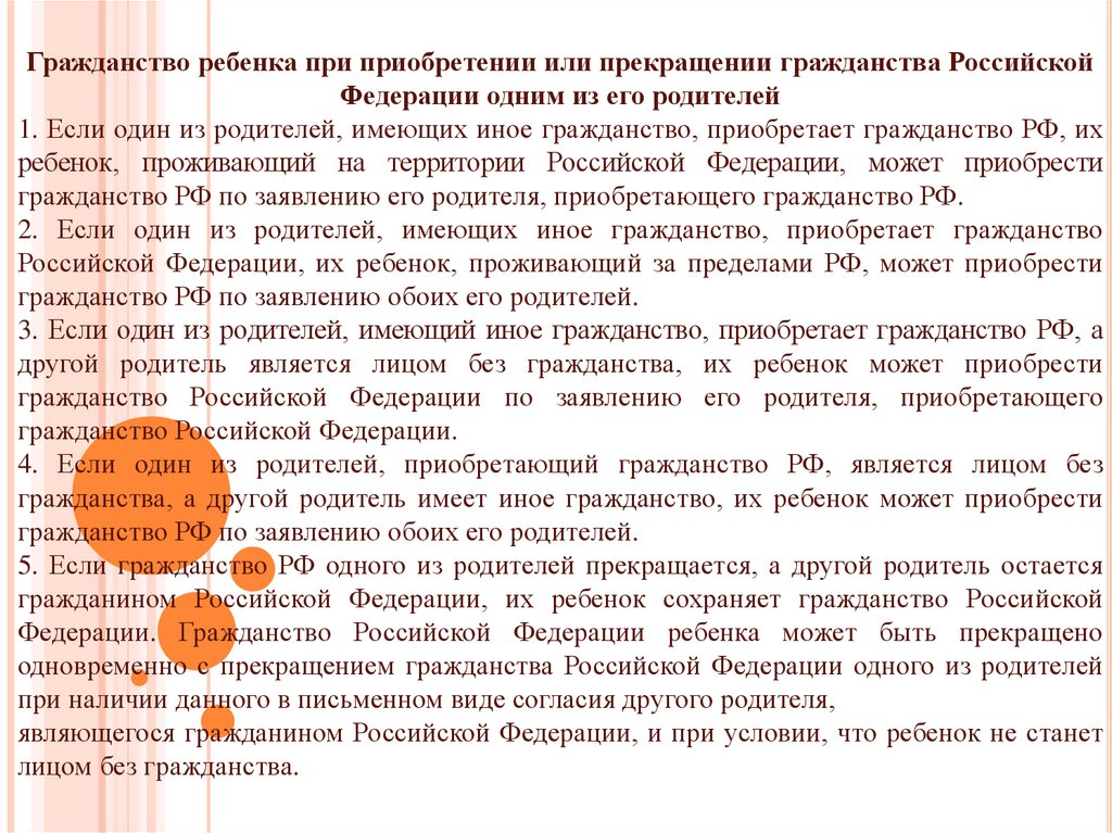 1. Если один из родителей, имеющих иное гражданство, приобретает гражданство РФ, их