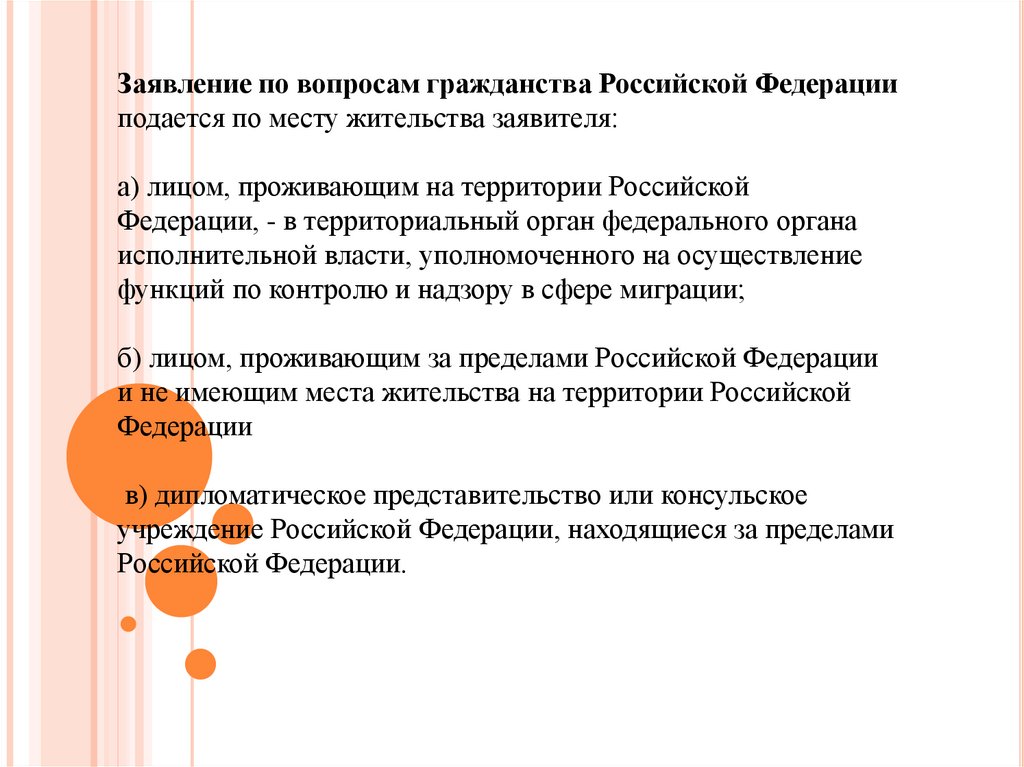Заявление по вопросам гражданства Российской Федерацииподается по месту жительства заявителя: