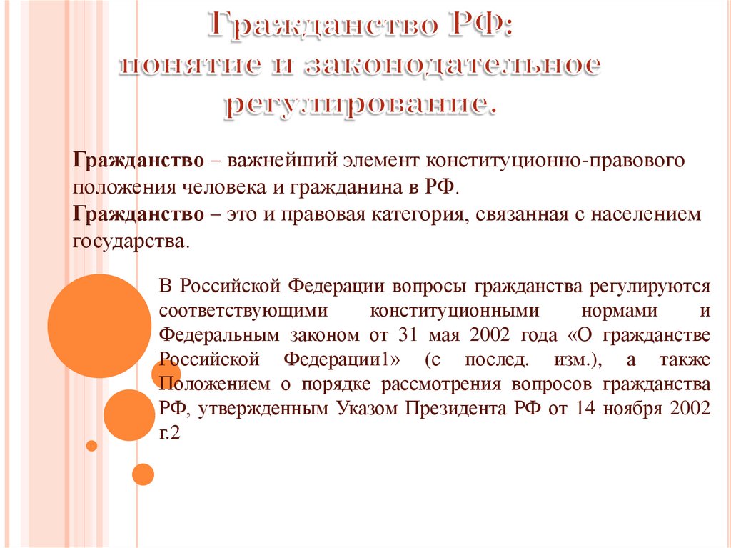 Гражданство – важнейший элемент конституционно-правовогоположения человека и гражданина в РФ.